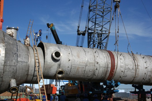 我公司為大唐國際內(nèi)蒙多倫及克旗煤化工項目現(xiàn)場制造了多臺大型塔器。其中一臺再吸收塔,高100米,直徑5.7米,僅用了三個多月時間便制作完成。成為該項目中唯一一個按合同期交貨的產(chǎn)品,公司也成為唯一受到業(yè)主及監(jiān)理方表揚的單位。制作的2臺直徑超過6米的復(fù)合板塔器也因質(zhì)量和工期等均能很好履約而受到業(yè)主及監(jiān)理方的好評。這充分展示了我公司在大型塔器制作方面具有雄厚的實力和高超的技術(shù)水平。